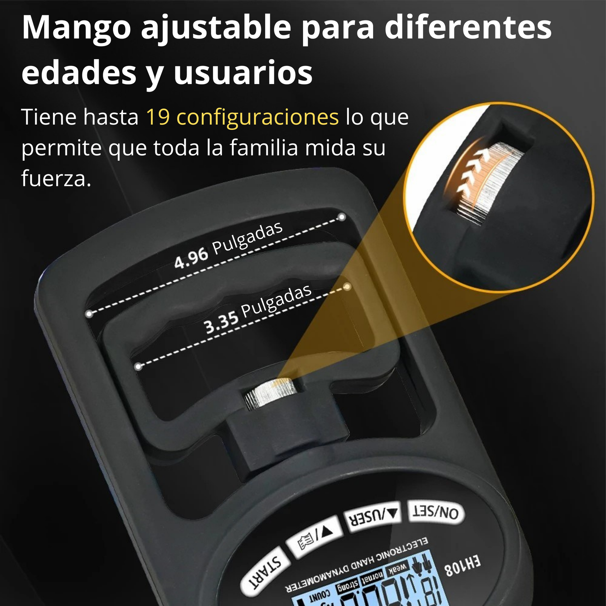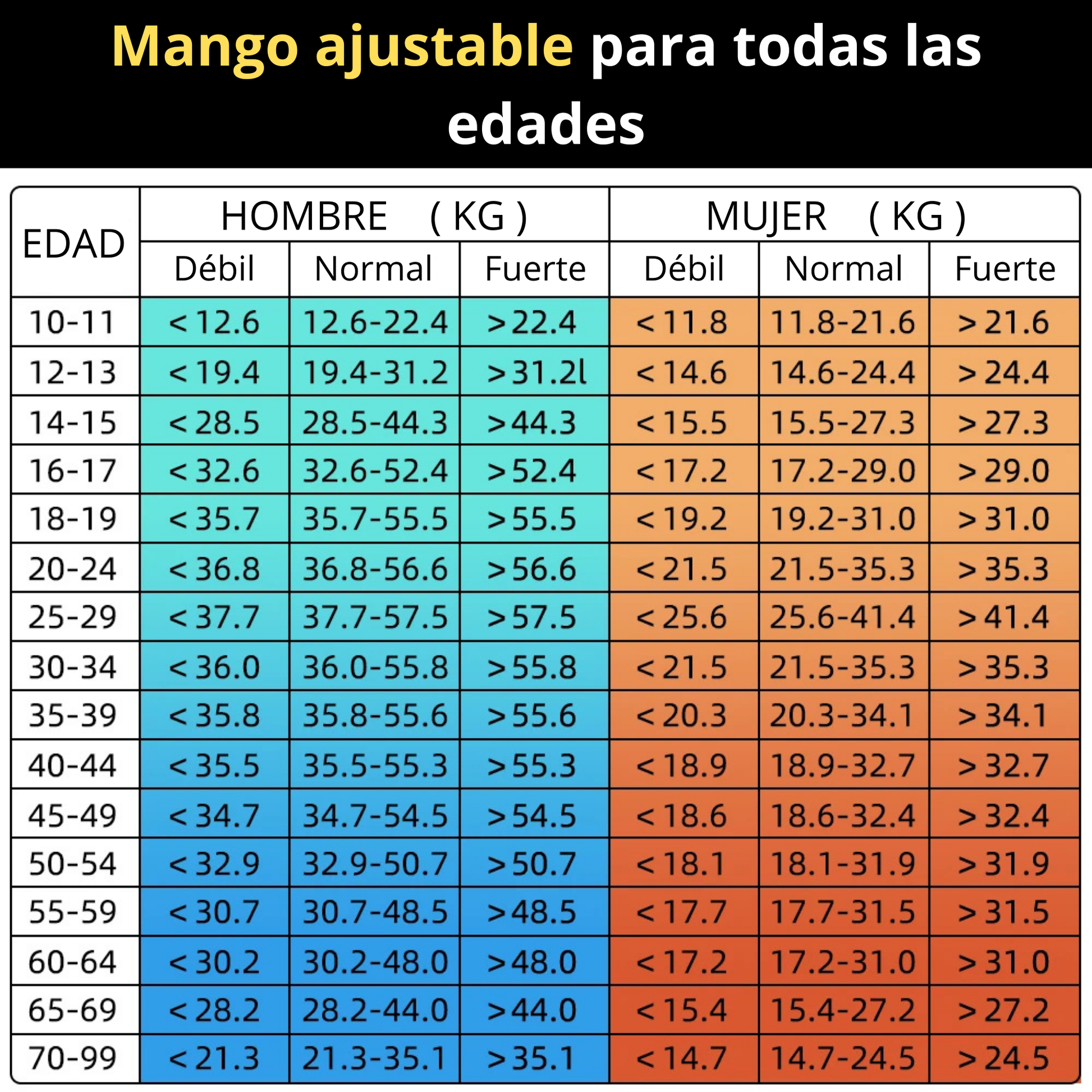 El mango es ajustable para adaptarse a distintos tamaños de mano, lo que lo hace perfecto para jóvenes, adultos, personas mayores y atletas.